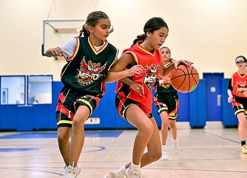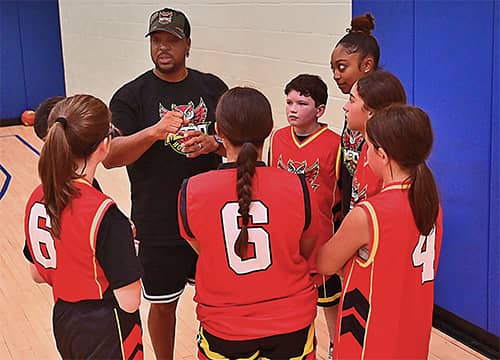 We teach fundamentals - ball handling, shooting, defense, and footwork - while building basketball IQ through decision-making and game awareness.